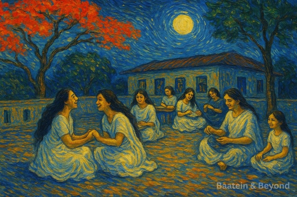 They recited lines by candlelight, wrapped each other’s feet in alta made from crushed hibiscus stolen from the temple garden. They sang Rabindranath’s forbidden verses and once even choreographed a short play — hidden behind the tall walls of the drying courtyard, under the watchful gaze of an old peepal tree.